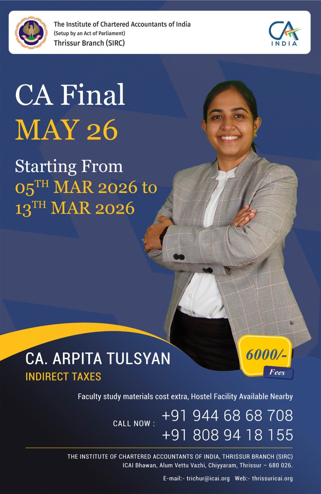 CA FINAL MAY 26 by CA.ARPITA TULSYAN ,INDIRECT TAXES from 05th March 2026 to 13th March 2026 Students 2 Views Download File Share this Post