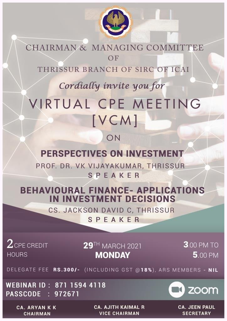 VIRTUAL CPE MEETING on PERSPECTIVES ON INVESTMENT by DR. V K VIJAYAKUMAR,THRISSUR & BEHAVIOURAL - FINANCE APPLICATIONS IN INVESTMENT DECISIONS by CS.JACKSON DAVID C,THRISSUR