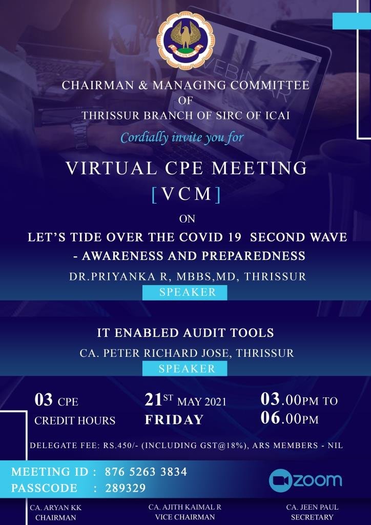 VIRTUAL CPE MEETING on LET'S TIDE OVER THE COVID 19 SECOND WAVE AWARENESS AND PREPAREDNESS & IT ENABLED AUDIT TOOLS by DR.PRIYANKA R ,THRISSUR & CA.PETER RICHARD JOSE ,THRISSUR