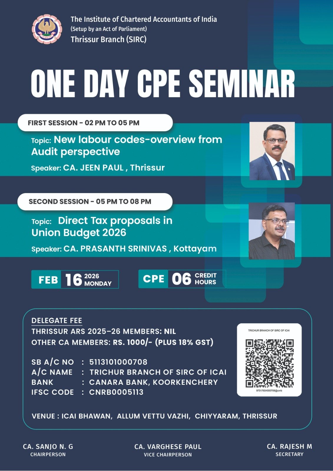 ONE DAY CPE SEMINAR on New labour codes -overview from Audit perspective by CA.JEEN Paul, Thrissur & Direct Tax Proposals in Union Budget 2026 by CA.PRASANTH SRINIVAS, Kottayam on 16th February 2026,Monday
