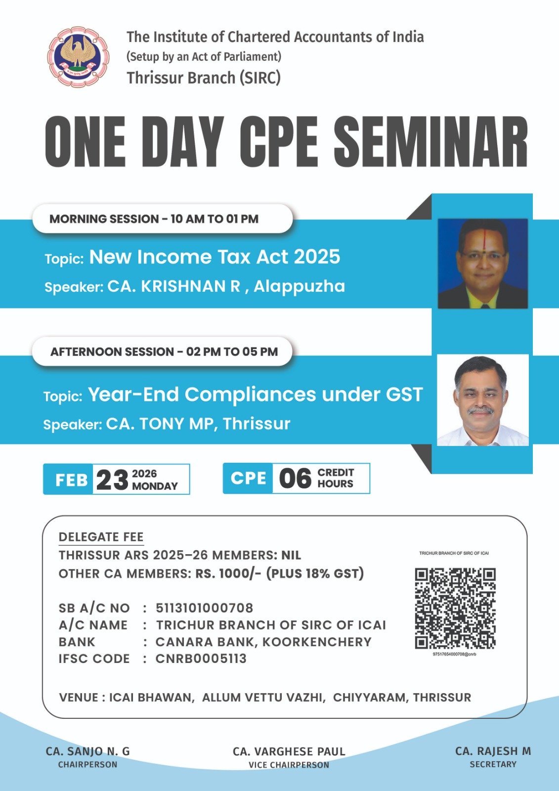 ONE DAY SEMINAR ON New Income Tax Act 2025" from 10.00AM to 01.00 by CA.KRISHNAN R, Alappuzha & "Year - End Compliances under GST" from 02.00 PM to 05.00 PM by CA.TONY M ,THRISSUR on 23rd,February 2026,Monday.