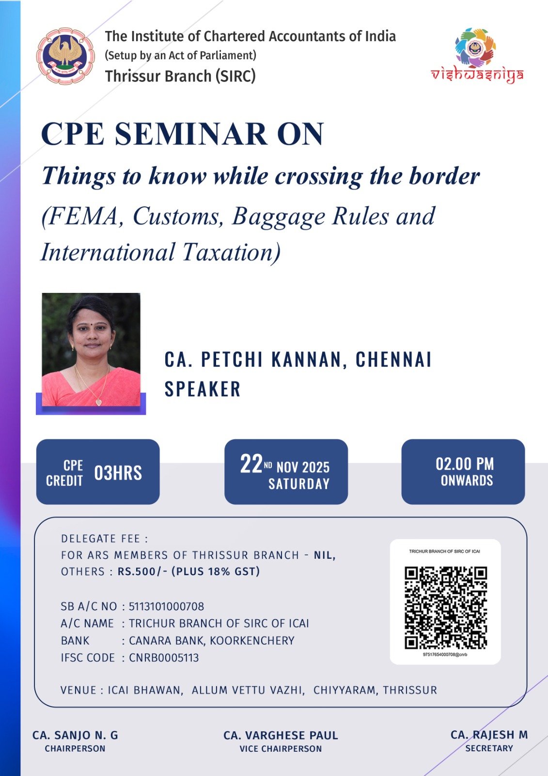 on 22 -11 -2025 CPE Credit: 3 Hours Venue: ICAI , Thrissur